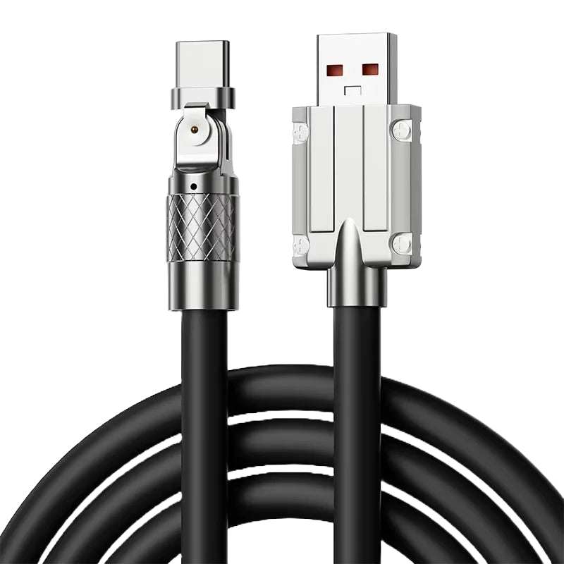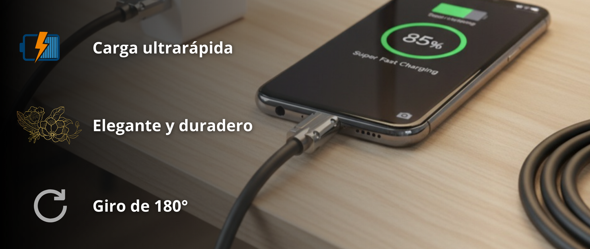 Diseñado para quienes buscan estilo y eficiencia en un solo accesorio. Este cable USB-C combina una apariencia elegante y moderna con un rendimiento superior gracias a su tecnología de carga súper rápida. Su conector giratorio de 180° ofrece total flexibilidad, ideal para usar el móvil mientras se carga sin incomodidades.